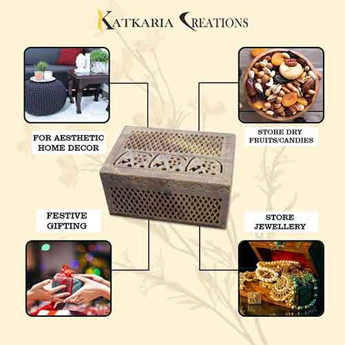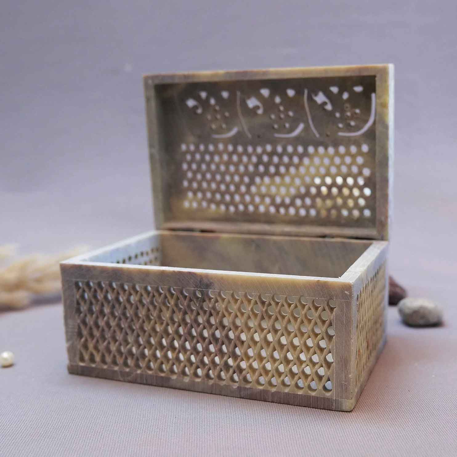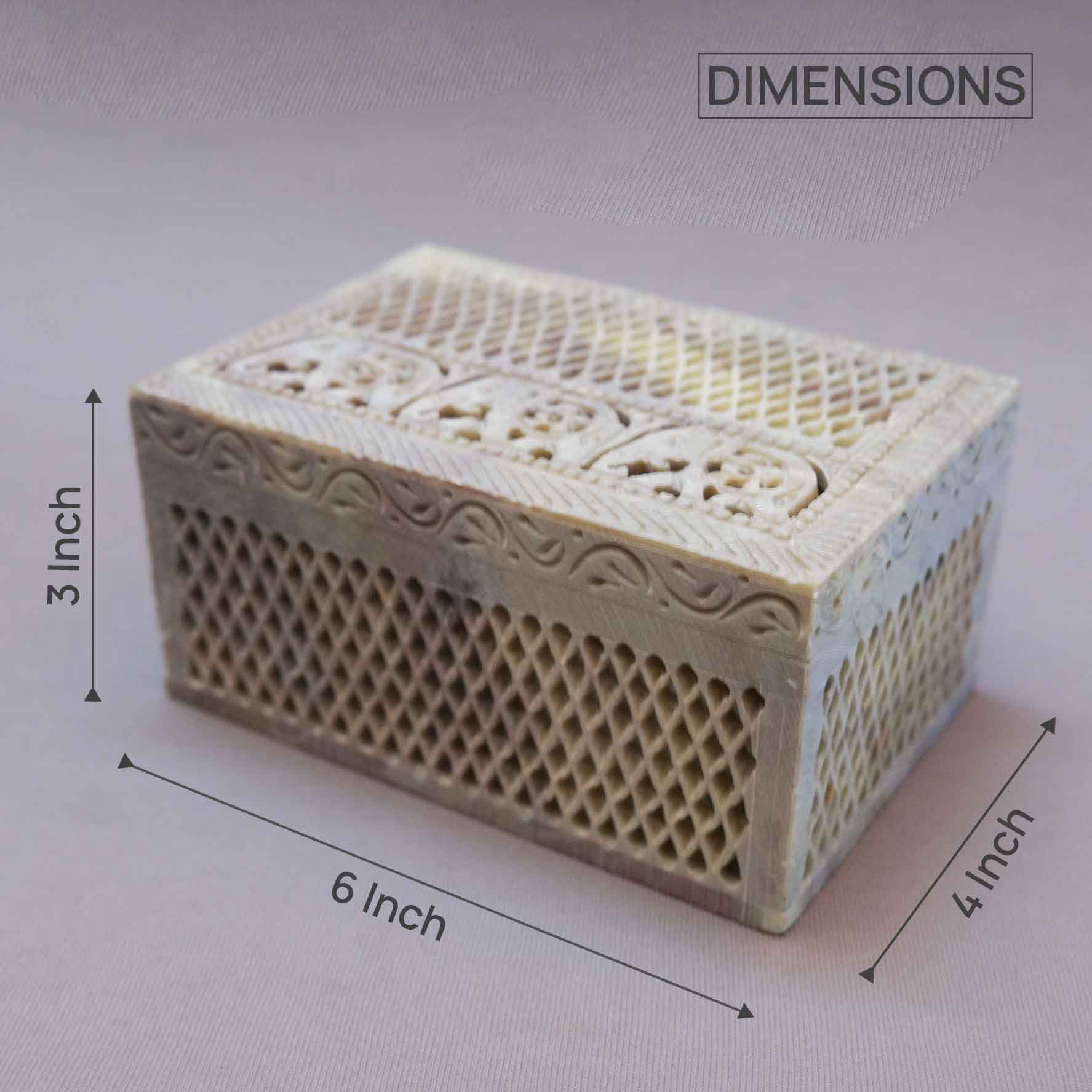 Total Dimensions in (Inches) -6? L X 4? W X 3? H Material – Natural Soapstone Store your knick knacks in this beautiful soapstone box. Great For storing jewellery, gifting and décor Perfect for your dressing rooms/tables to store fine jewellery pieces.