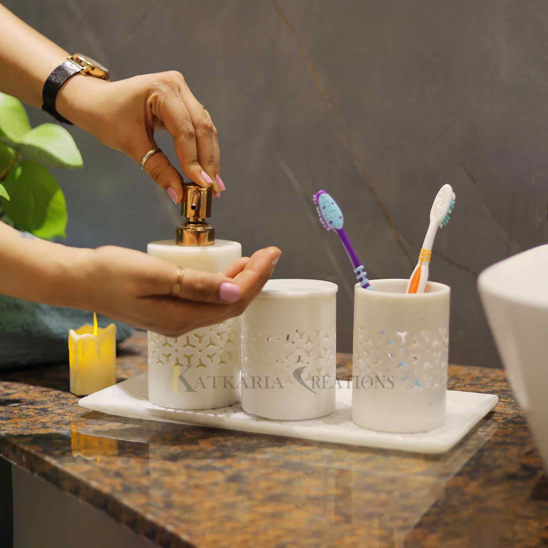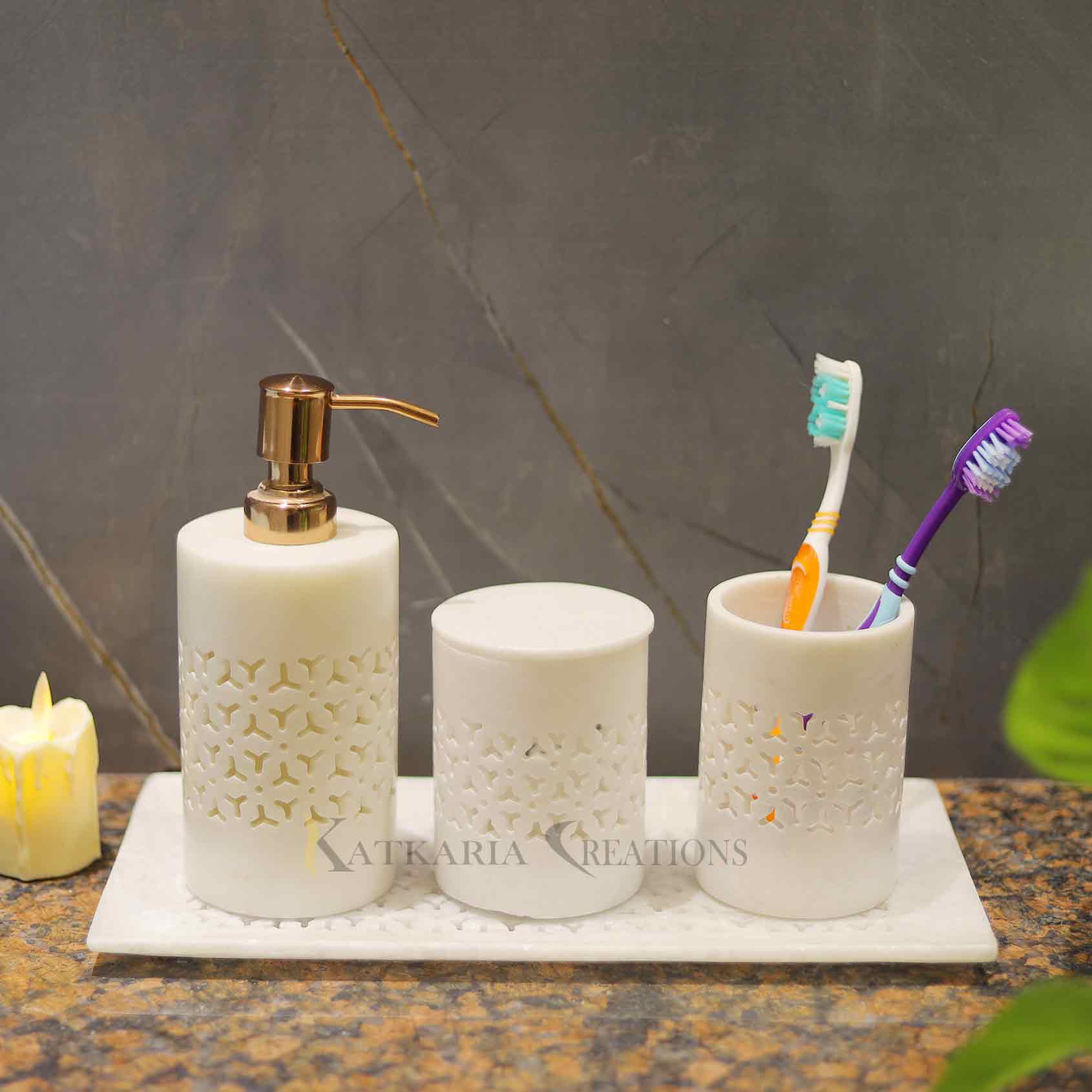 - Box Contains : Soap Dispenser, Toothbrush Holder, Cotton/Misc. Box, Tray.