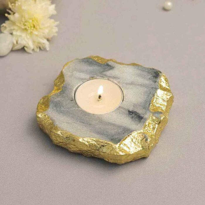 DIMENSIONS (LxBxH) (IN INCH) : 4 x 4 x 1 MATERIAL : Kayampura Stone & Gold Foil COLOUR : Grey and Golden MULTIFUCTIONAL: The stand can also be used as candle holder, dhoopbatti holder and camphor balls. QUALITY : This Tea Light Candle Holder is handmade from kayampura stone by the Indian Artisans with High-quality craftsmanship ensures durability and longevity. HANDMADE : The product is handmade and 100% made from natural raw material, no harsh chemicals are released when natural stone come in contact with heat unlike ceramic, plastic and wood products.